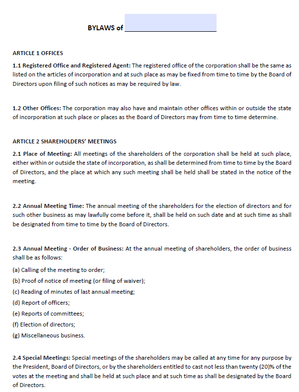 Corporate bylaws are typically created shortly after a company files their articles of incorporation. Although bylaws may not be legally required in your state, it's generally a good idea for a company to draft bylaws in order for the company to have a legal document laying out how the company will operate.  Corporate bylaws provide an outline of a corporation's purpose, operations, and the duties and responsibilities of directors, officers, and shareholders. Bylaws may also specify how the company will issue stock, appoint or remove officers or directors, and requirements for annual meetings.
