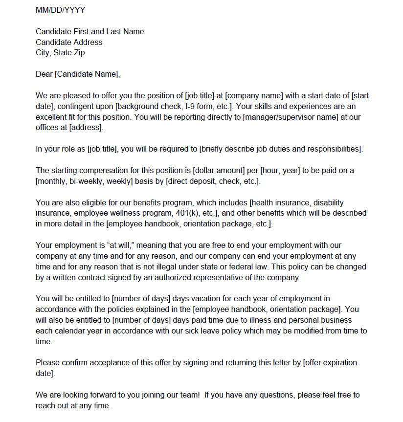 Once you've discussed a job offer with a potential candidate, it's best to follow up with an official employee offer letter. The employee offer letter formally offers a position to a job applicant, summarizes the main terms and conditions of the offer, and provides details about the role and company to help a candidate decide whether or not to accept the offer. It may also serve as a starting point for employment negotiations. Because every company and job applicant are different, we provide a template of an employee offer letter. You can copy the template onto your company's letterhead. We indicate in the template where to include information about your company and the applicant to make the letter most useful.
