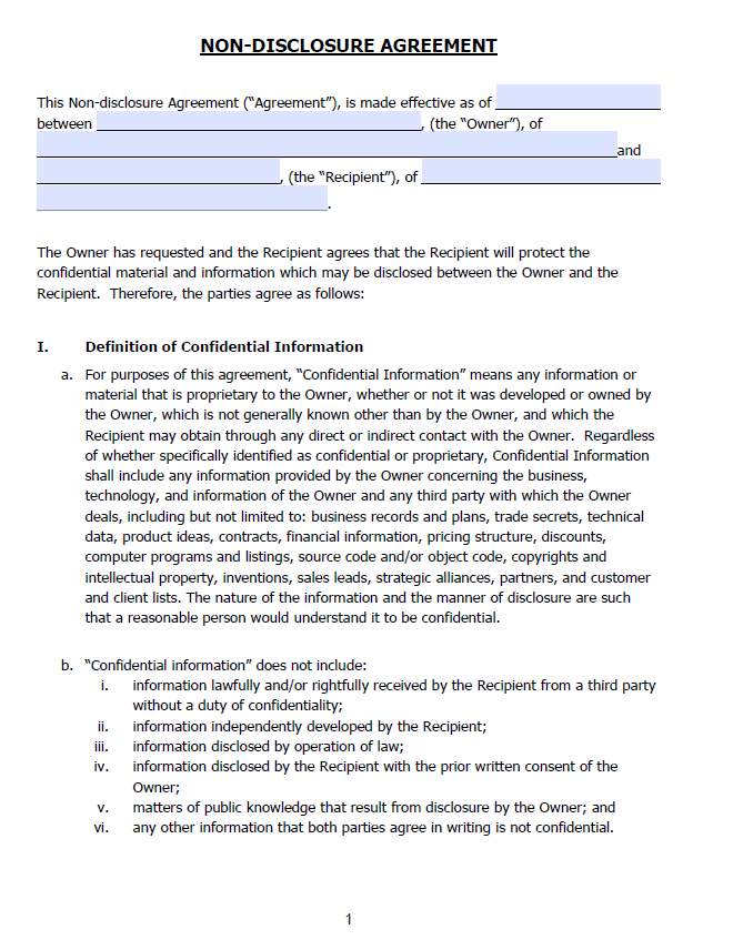 A unilateral or "one way" nondisclosure agreement protects your confidential company information such as trade secrets, proprietary information, customer data, your business' technology, and intellectual property from an organization or person outside the company. For example, you may want to ask contractors or employees you considering hiring to sign an NDA. NDAs allow a company to to establish what company information should be kept confidential and outlines potential penalties and legal ramifications for disclosing such confidential information to third parties before sharing or disclosing any confidential information with third parties.